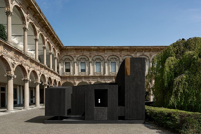在米兰大学Cortile d'Onore的古典庭院中,YARDCOM院半与吴滨共同呈现了艺术装置《奥庭》。奥庭,是有限之庭中,一段可被行走、被凝视、被体悟的"心象山水"。吴滨通过材料的尺度、重量与感知属性,生成空间节奏与行走路径,使空间在行走中被理解,以材料连接身体、空间与意识,引导公众重新思考人与天地的关系,在有限的物质空间中,开启无限的精神游观。
